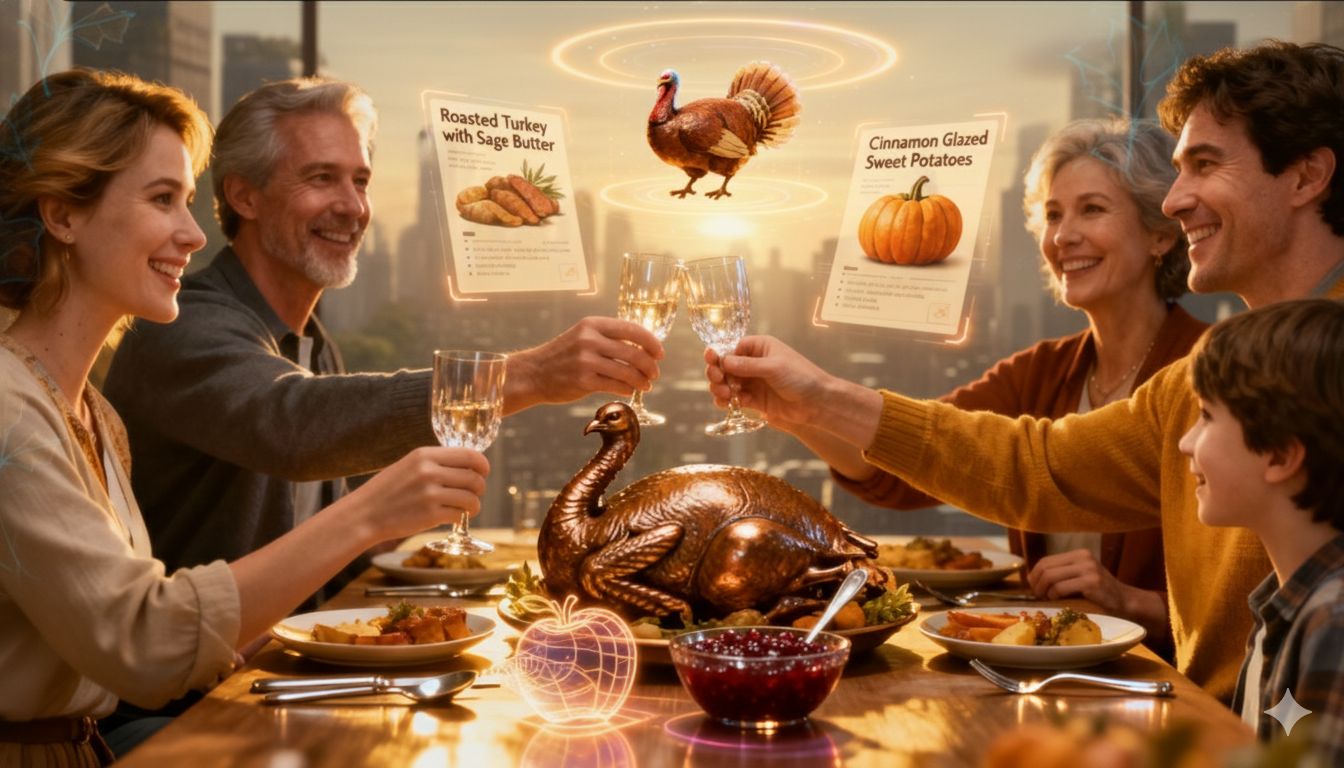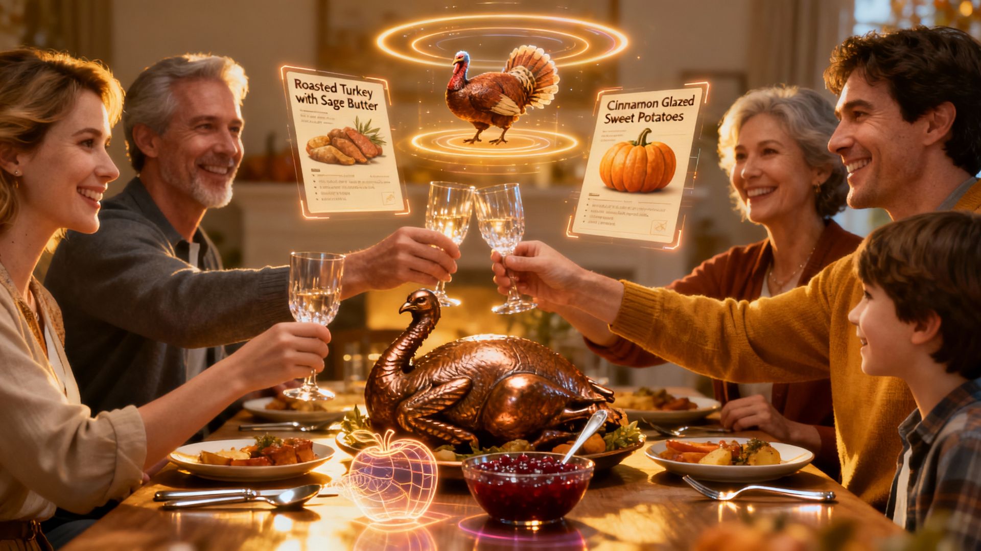 Create a hyper-realistic, cinematic image of a modern Thanksgiving dinner in the near future. Show warm, golden lighting; subtle holographic decor; floating recipe cards; and a family raising their glasses in a heartfelt toast. Style direction: "Apple holiday commercial meets Norman Rockwell." Clean, elegant, emotional, and inspiring.