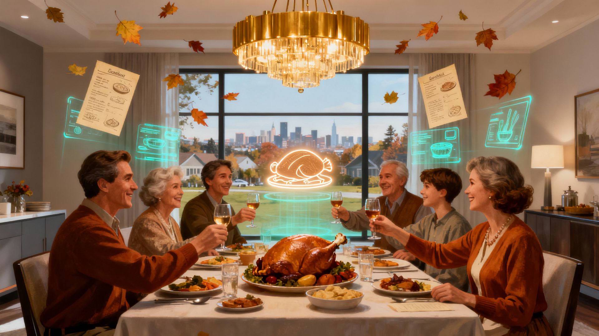 The final composite image brings together the best aspects of each AI's interpretation. We'll retain the warm, golden cinematic lighting and heartfelt emotion. The subtle holographic elements will be more integrated, perhaps with glowing recipe cards and autumnal leaves that seem to shimmer and drift, enhancing the sense of a technologically advanced yet cozy atmosphere. The family will be actively engaged in a toast, their expressions radiating genuine happiness, with a focus on their connection. We'll aim for a blend of the sleek, modern aesthetic with the timeless, inviting feeling of a classic holiday.