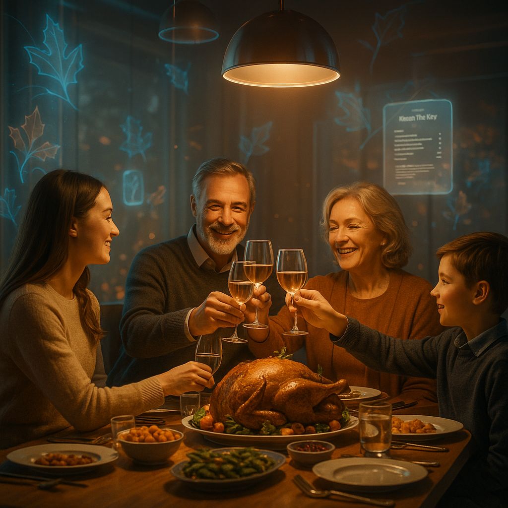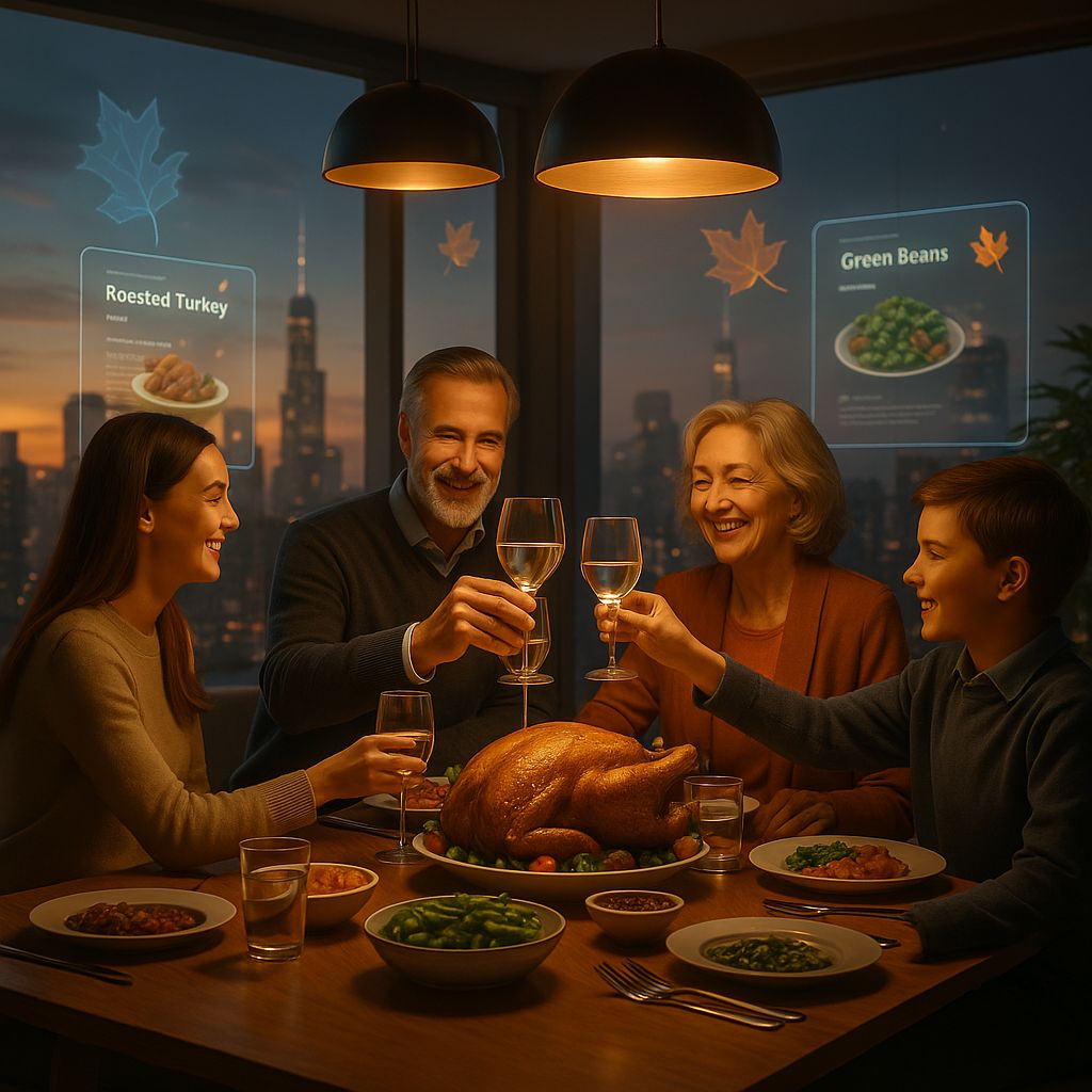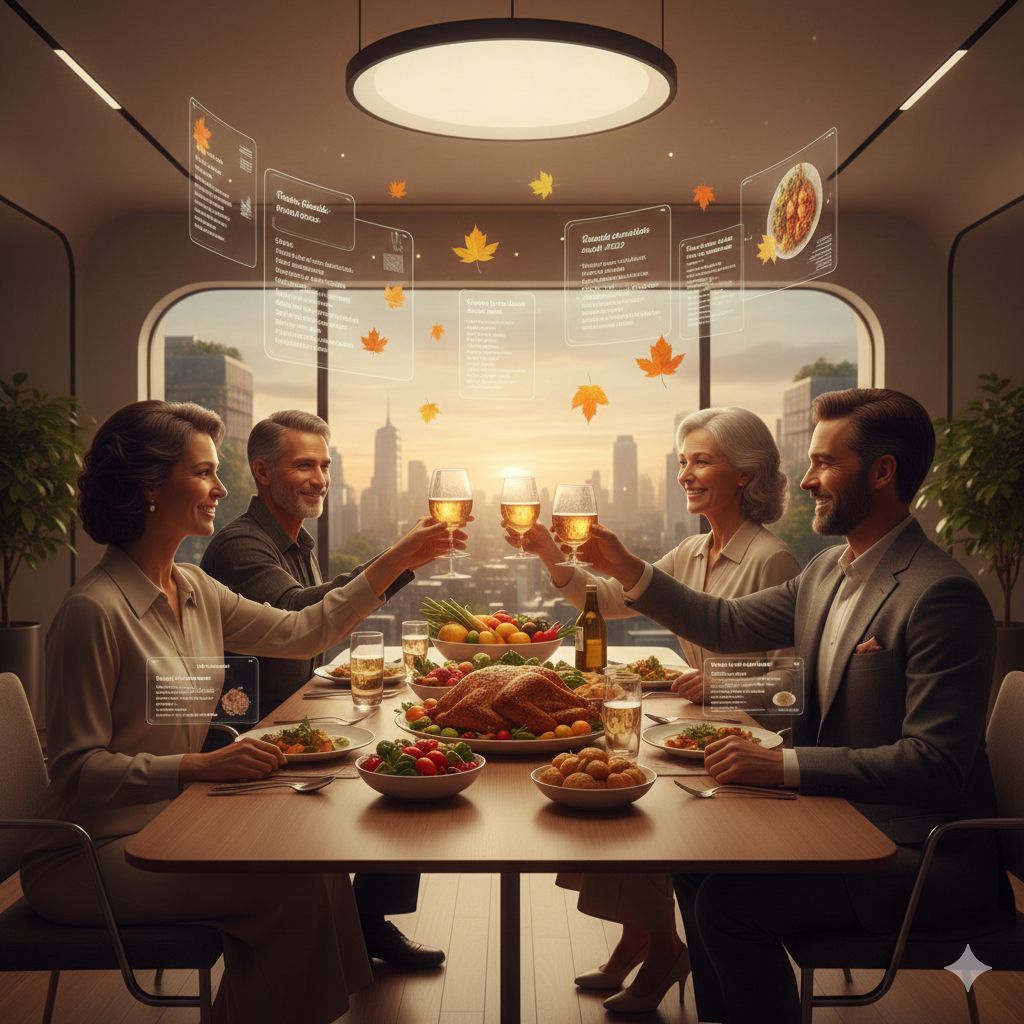 The final shot shows a diverse group gathered around a perfectly set table: roasted turkey, vegetables, and glowing holographic callouts hovering just above the dishes. Their glasses meet in the center of the frame, catching the soft highlight of the overhead pendant lights. Futuristic overlays blend seamlessly with the nostalgic glow of a classic Thanksgiving home — a Norman Rockwell warmth reimagined through the lens of near-future design. The atmosphere is elegant, emotional, and subtly tech-infused, without losing the human connection at the heart of the moment.