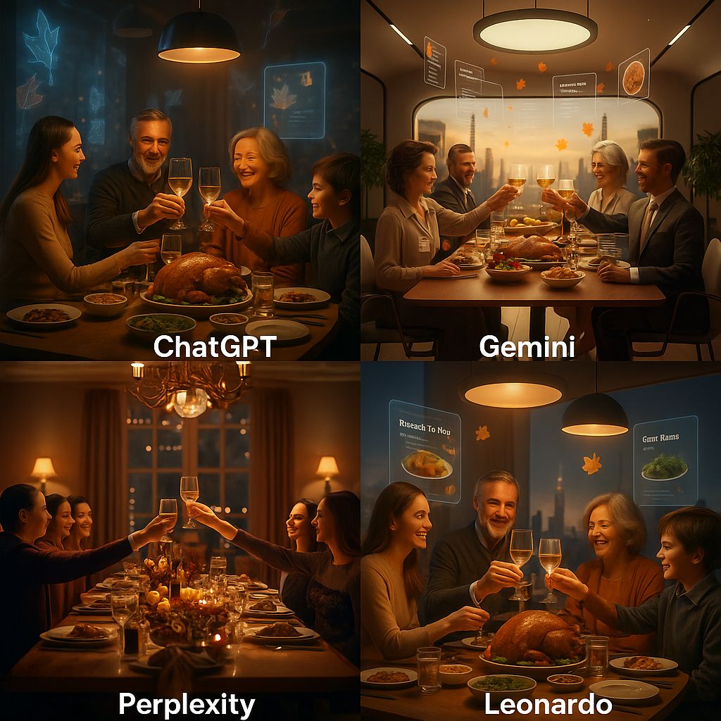 Thanksgiving is one of the richest visual settings you can give an AI: warm light, real emotion, reflective surfaces, family expressions, and subtle details that define connection. Ask four different AI models to interpret the same scene, and you’ll quickly see how each one “thinks.”