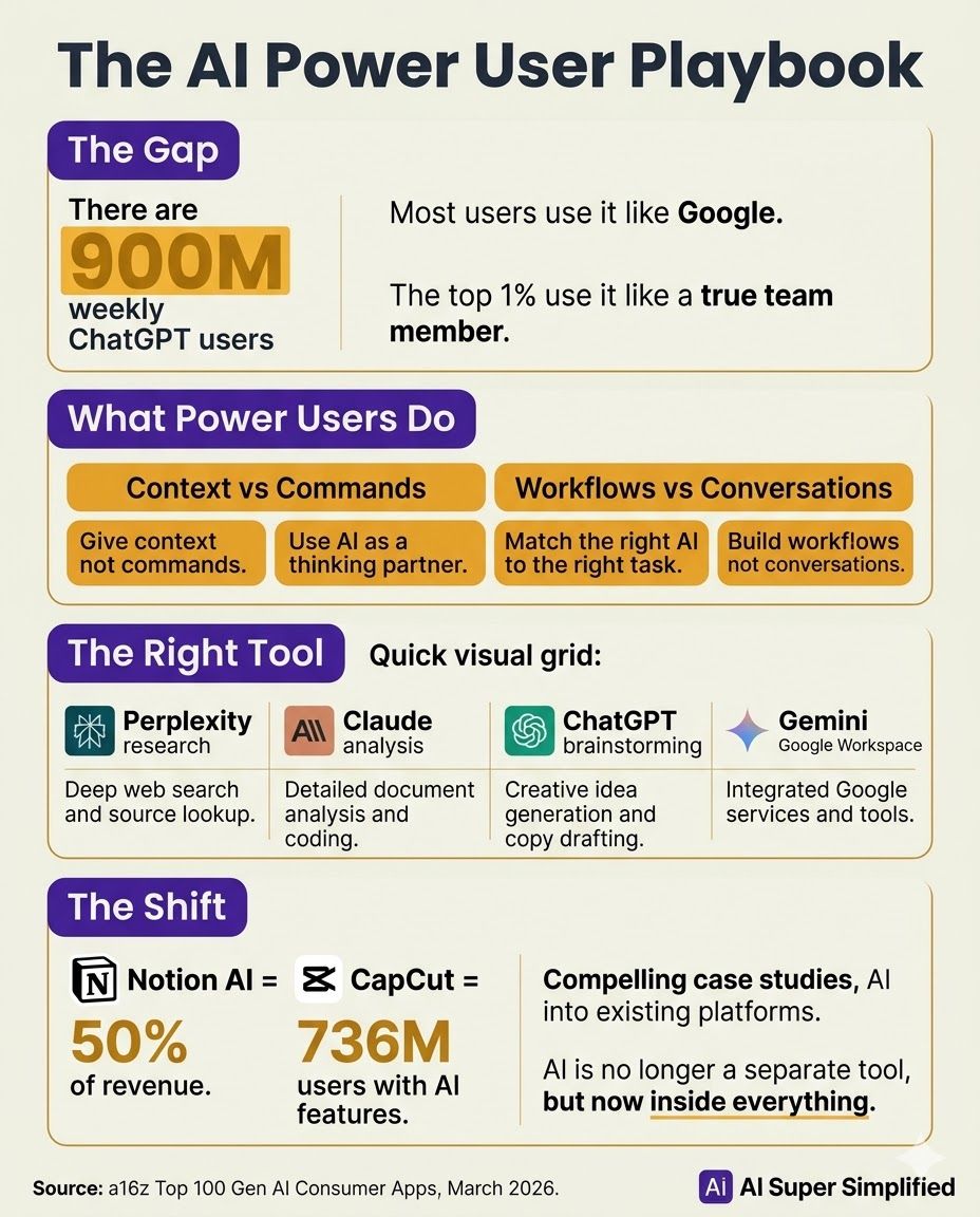 A16Z just dropped the definitive report on how people use AI in 2026. The data reveals a massive gap between casual users and power users — and a few specific behaviors that separate them. Here's what the top users do differently, plus a prompt to level up immediately.