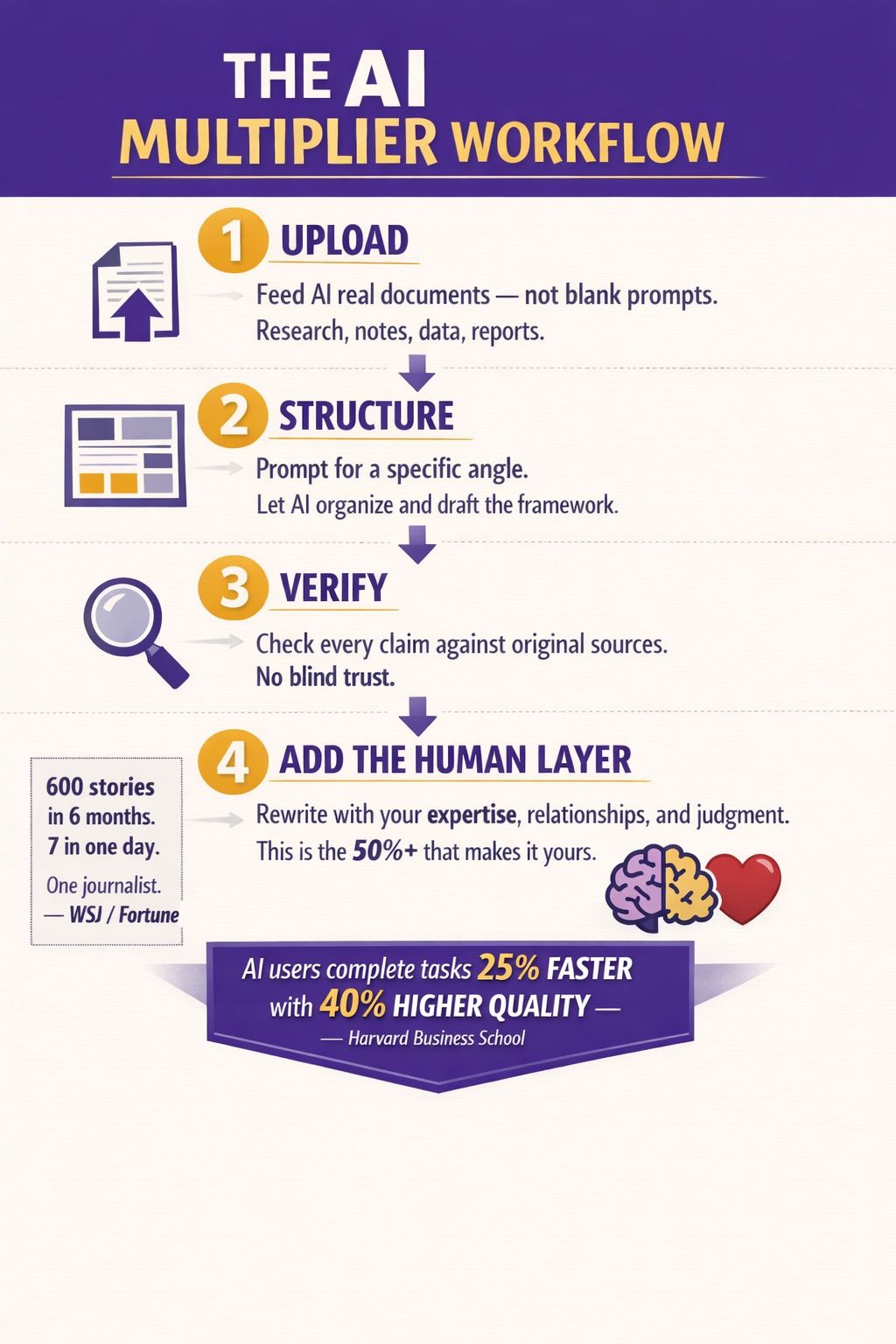 2. Prompt for structure, write the soul. He asks AI to draft from a specific angle he's already chosen. Then he rewrites the opening with original insight from his own reporting and sources.